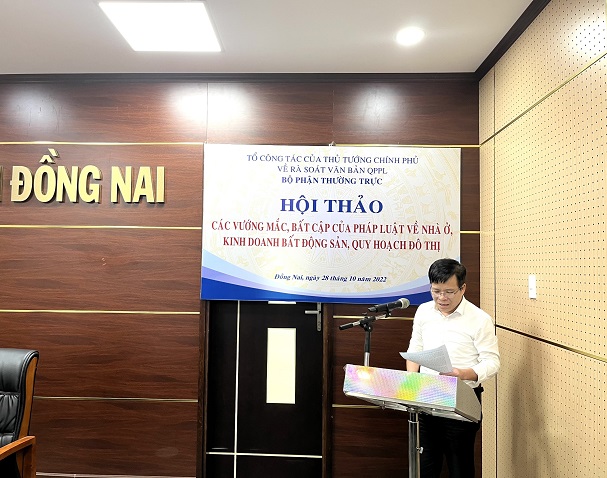 Phát biểu khai mạc Hội thảo, Phó Cục trưởng Cục Kiểm tra văn bản QPPL Nguyễn Thị Thu Hoè khẳng định, nhà ở, kinh doanh bất động sản, quy hoạch đô thị là lĩnh vực pháp luật quan trọng, tác động mạnh mẽ, trực tiếp đến sự phát triển của đời sống kinh tế - xã hội ở nước ta. Theo Kế hoạch, trong năm 2022, rà soát hệ thống pháp luật về xây dựng, kinh doanh bất động sản, quy hoạch đô thị được Tổ Công tác của Thủ tướng Chính phủ về rà soát văn bản QPPL xác định là một trong những nội dung rà soát nhằm có định hướng hoàn thiện hệ thống pháp luật trong lĩnh vực này. Việc tổ chức Hội thảo “Các vướng mắc, bất cập của pháp luật về nhà ở, kinh doanh bất động sản, quy hoạch đô thị” để trao đổi, thảo luận nhằm nhận diện đầy đủ những mâu thuẫn, chồng chéo, không còn phù hợp; đồng thời phát hiện những quan hệ xã hội mới phát sinh, chưa được pháp luật điều chỉnh. Hội thảo được tổ chức tại tỉnh Đồng Nai - một trong 3 địa phương của Vùng kinh tế trọng điểm phía Nam, nơi có sự phát triển kinh tế - xã hội năng động, nhanh chóng, mạnh mẽ, nhất là trong các lĩnh vực xây dựng, kinh doanh bất động sản và quy hoạch đô thị.