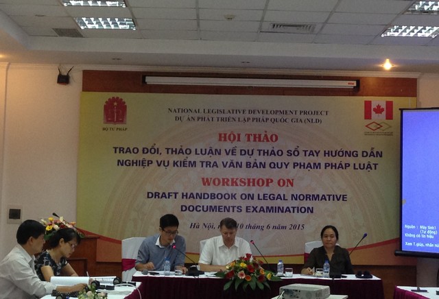 Nhằm giúp các cơ quan, người làm công tác kiểm tra văn bản nâng cao nghiệp vụ, kiến thức và hiệu quả công tác kiểm tra, Cục Kiểm tra văn bản, Bộ Tư pháp biên soạn cuốn “Sổ tay hướng dẫn nghiệp vụ kiểm tra văn bản quy phạm pháp luật”. Để hoàn thiện dự thảo Sổ tay, ngày 10/6/2015 Cục Kiểm tra văn bản đã tổ chức Hội thảo trao đổi, thảo luận về dự thảo Sổ tay hướng dẫn nghiệp vụ kiểm tra văn bản quy phạm pháp luật. Hội thảo diễn ra dưới sự chủ trì của bà Mạc Thị Hoa - Phó Cục trưởng phục trách Cục Kiểm tra văn bản, Bộ Tư pháp và ông Isabeau Vilandre - Giám đốc Văn phòng dự án Phát triển lập pháp quốc gia tại Việt Nam (National Legislative Development Project), cùng sự tham gia, góp ý của các chuyên gia có nhiều kinh nghiệm trong lĩnh vực kiểm tra văn bản QPPL và đại diện một số Bộ, ngành, địa phương.