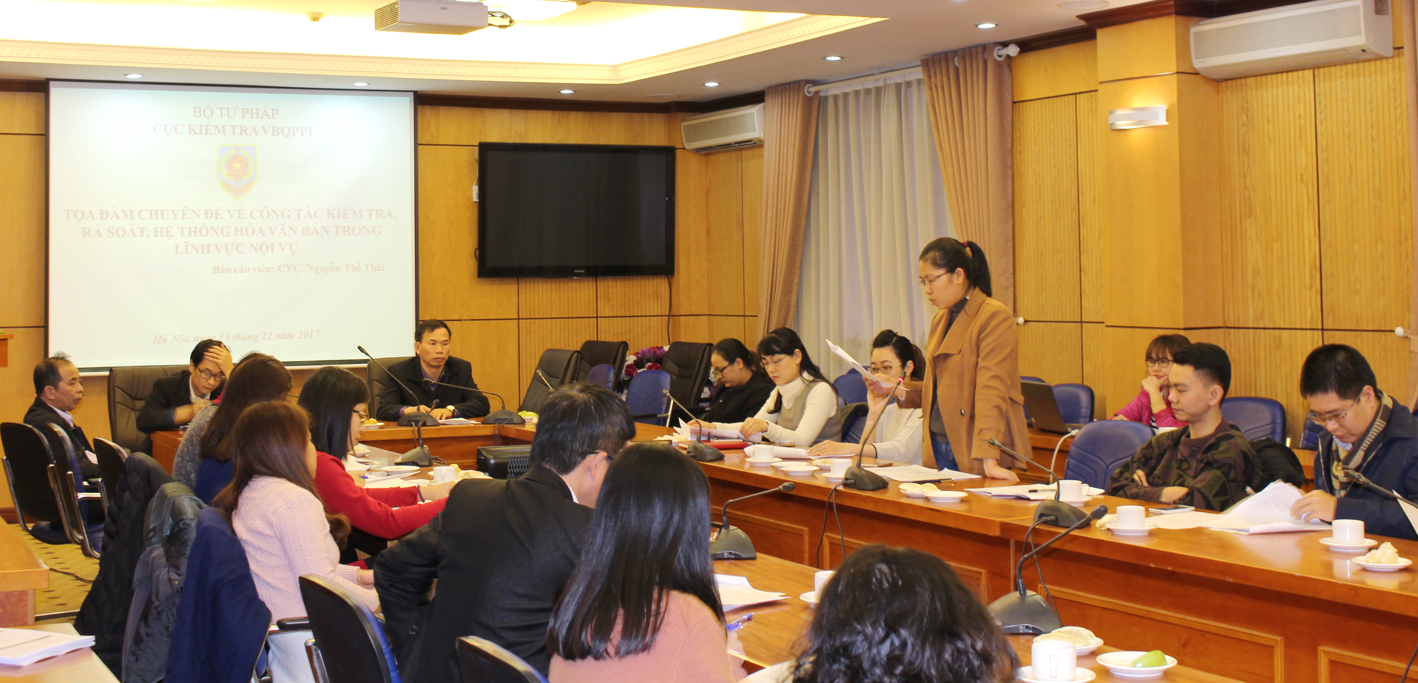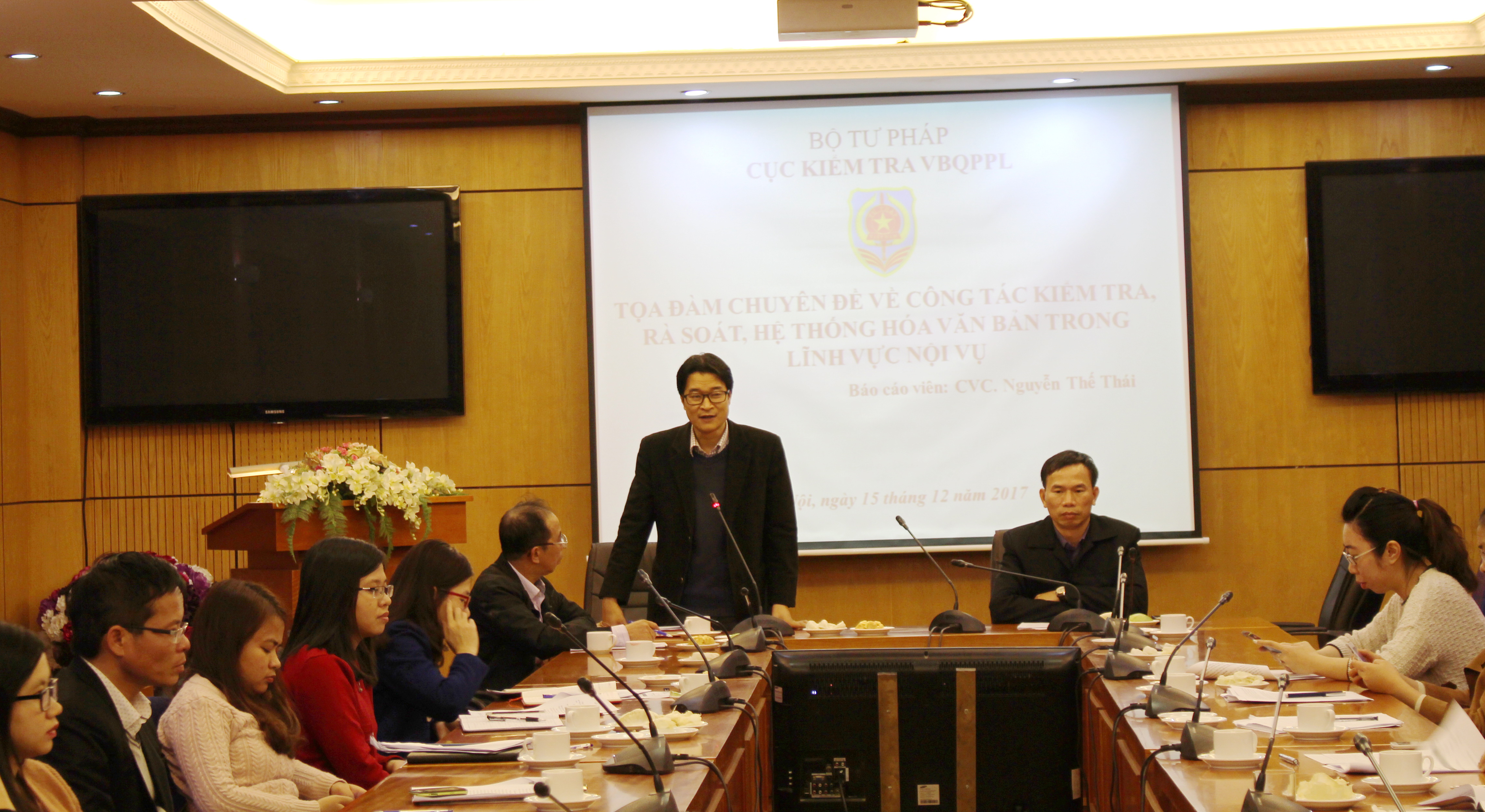 Tại Tọa đàm, đồng chí Nguyễn Thế Thái, chuyên viên chính của Phòng Kiểm tra, rà soát, hệ thống hóa văn bản QPPL khối nội chính được giao “chuyên quản” Bộ Nội vụ của Cục đã trình bày báo cáo tổng quát về tình hình thực hiện công tác kiểm tra, rà soát, hệ thống hóa văn bản của Bộ Nội vụ trong thời gian từ năm 2016 đến nay; đánh giá ưu điểm và hạn chế của Bộ Nội vụ trong các công tác này; kiến nghị những giải pháp nhằm nâng cao hiệu quả của công tác kiểm tra, rà soát, hệ thống hóa văn bản và chất lượng của văn bản QPPL của Bộ Nội vụ.