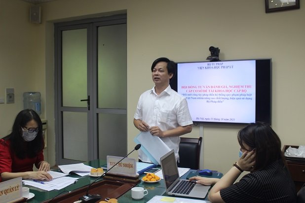 Tại Hội đồng, được sự ủy quyền của Chủ nhiệm Đề tài, Ths. Nguyễn Duy Thắng, Phó Cục trưởng Cục Kiểm tra văn bản QPPL, Thư ký khoa học Đề tài đã báo cáo kết quả nghiên cứu Đề tài. Theo đó, Đề tài đã phân tích, đánh giá khách quan, đúng thực trạng cũng như đề ra các giải pháp đổi mới nhằm nâng cao chất lượng của Bộ pháp điển cũng như chất lượng, hiệu quả của công tác xây dựng, cập nhật, quản lý, duy trì, tuyên truyền về Bộ pháp điển. Cụ thể, sau hơn 8 năm triển khai thực hiện Pháp lệnh pháp điển, công tác pháp điển đã đạt được nhiều kết quả tích cực, thậm trí có tính vượt trội. Cho đến nay, Bộ Tư pháp và các bộ, ngành đã hoàn thành pháp điển và trình Chính phủ thông qua 185/271 đề mục. Bước đầu, Bộ pháp điển đã được xã hội ghi nhận và khai thác, sử dụng.