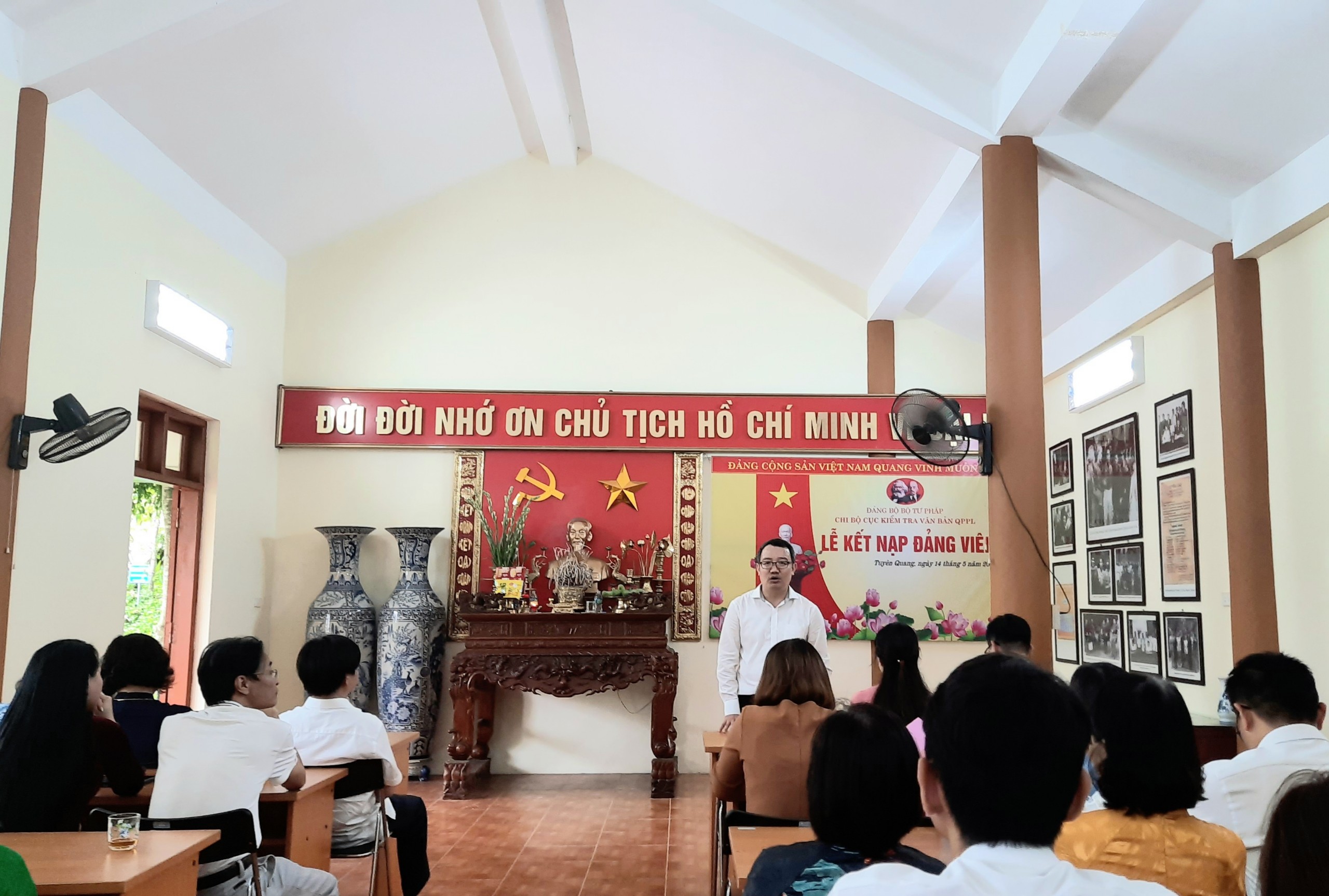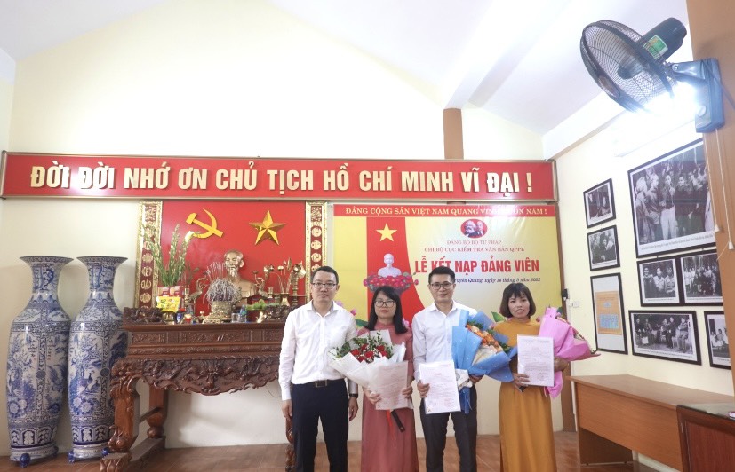 Tại Khu di tích lịch sử Bộ Tư pháp, Chi bộ Cục Kiểm tra văn bản QPPL cũng đã tổ chức Lễ kết nạp đảng viên cho 03 quần chúng ưu tú (đồng chí Nguyễn Thị Trà, Vũ Thị Mai và Nguyễn Văn Đức). Đồng chí Hồ Quang Huy - Ủy viên BCH Đảng Bộ, Bí thư Chi bộ Cục Kiểm tra văn bản QPPL đã công bố và trao Quyết định kết nạp đảng viên của Ban Thường vụ Đảng ủy Bộ. Chúc mừng 03 đồng chí quần chúng ưu tú, sau một thời gian phấn đấu, rèn luyện đã vinh dự được đứng trong hàng ngũ của Đảng Cộng sản Việt Nam. Đây là sự ghi nhận của Đảng bộ, Chi bộ và tập thể Cục Kiểm tra văn bản QPPL đối với sự cố gắng, phấn đấu của 03 đồng chí trong suốt thời gian qua, đồng thời đồng chí Hồ Quang Huy yêu cầu các đồng chí Đảng viên mới nghiêm túc thực hiện nghĩa vụ của người đảng viên, tiếp tục tu dưỡng, rèn luyện, phấn đấu, học tập, nâng cao nhận thức chính trị và năng lực chuyên môn, góp phần xây dựng Chi bộ trong sạch, vững mạnh.