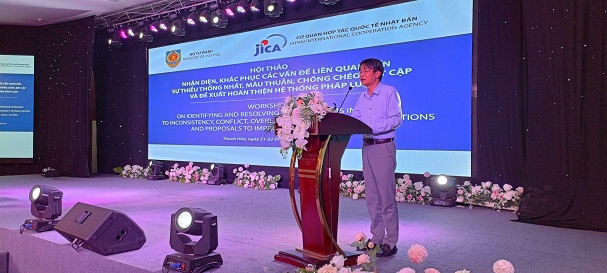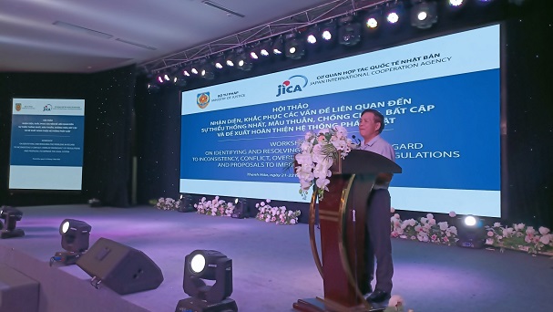 Hội thảo đã được nghe 09 bài tham luận của các chuyên gia, nhà khoa học xoay quanh chủ đề của Hội thảo và nhiều ý kiến phát biểu của các đại biểu tham dự. Với tinh thần trách nhiệm, trí tuệ, tâm huyết với công tác xây dựng, hoàn thiện pháp luật và thi hành pháp luật của Nhà nước, thông qua các góc nhìn đa dạng, các đại biểu đã tập trung trao đổi, thảo luận, phân tích, đánh giá để nhận diện đầy đủ, sâu sắc các vấn đề liên quan đến sự thiếu thống nhất, mâu thuẫn, chồng chéo, bất cập của hệ thống pháp luật Việt Nam trên cơ sở kết quả rà soát văn bản QPPL thời gian qua. Các chuyên gia đại diện phía JICA cũng có những trao đổi, chia sẻ kinh nghiệm của Nhật Bản trong hoạt động xây dựng, hoàn thiện pháp luật nói chung, khắc phục những bất cập, hạn chế của pháp luật nói riêng.
