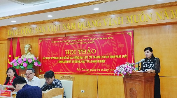 Tại Hội thảo, các chuyên gia trong công tác rà soát văn bản QPPL, chuyên gia trong lĩnh vực pháp luật về tài chính, đầu tư và doanh nghiệp của Vụ Pháp chế, Bộ Tài chính; Vụ Pháp chế, Bộ Kế hoạch và Đầu tư đã thông tin tình hình triển khai và kết quả rà soát đối với các vấn đề bất cập, không phù hợp với thực tiễn của các quy định pháp luật có liên quan đến một số luật như Luật Thuế giá trị gia tăng; Luật Quản lý, sử dụng vốn nhà nước đầu tư vào sản xuất, kinh doanh tại doanh nghiệp; Luật Phí và lệ phí; Luật Ngân sách nhà nước; Luật Điện lực; Luật Hợp tác xã; Luật Đấu thầu; Luật Đầu tư theo phương thức đối tác công tư (PPP); Luật Doanh nghiệp; Luật Quy hoạch...