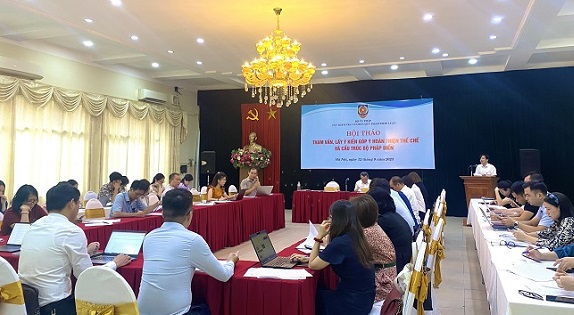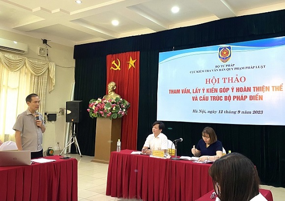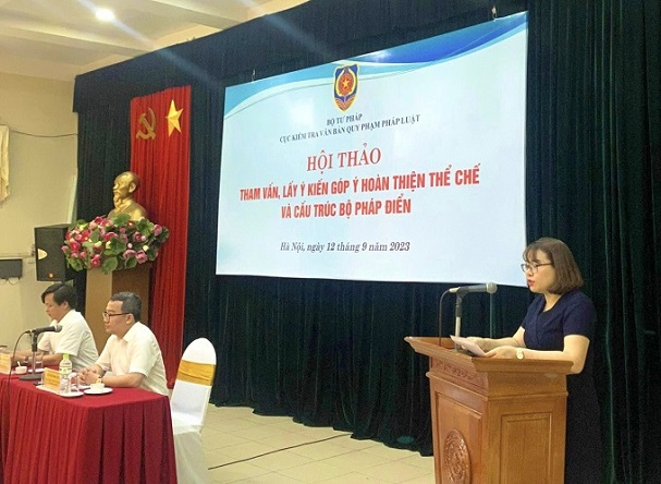 Phát biểu khai mạc, đồng chí Hồ Quang Huy, Cục trưởng Cục Kiểm tra văn bản QPPL đánh giá Bộ pháp điển hiện nay đã hoàn thành hơn 98% khối lượng, đạt được mục tiêu lộ trình xây dựng Bộ pháp điển đề ra, bước đầu được xã hội đón nhận, khai thác và sử dụng. Trong thời gian tới, để tiếp tục hoàn thiện Bộ pháp điển, đưa Bộ pháp điển thực sự đi vào cuộc sống, Bộ Tư pháp tổ chức Hội thảo “Tham vấn, lấy ý kiến góp ý hoàn thiện thể chế và cấu trúc Bộ pháp điển”, đồng thời, tập trung trao đổi, thảo luận vào những nội dung trong Dự thảo Đề án “Nâng cao chất lượng và hiệu quả khai thác, sử dụng Bộ pháp điển” dự kiến trình Thủ tướng Chính phủ vào tháng 10/2023.