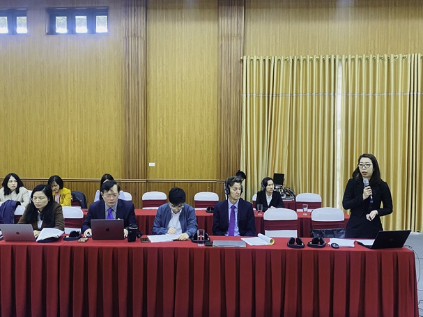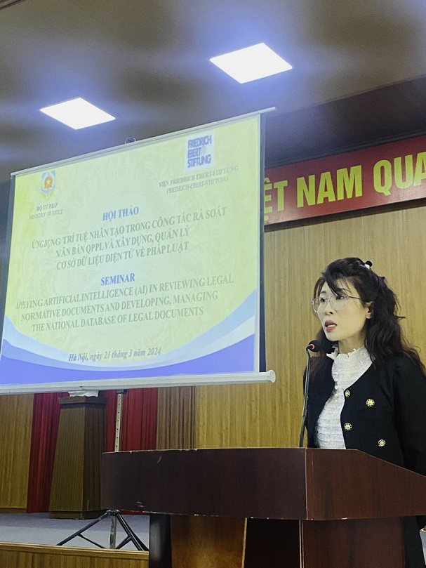 Tại Hội thảo, Bà Hoàng Linh Cầm, Phó Chánh Văn phòng, Cục Kiểm tra văn bản quy phạm pháp luật, Bộ Tư pháp đã trình bày nội dung về thực trạng và nhu cầu ứng dụng trí tuệ nhân tạo trong công tác rà soát văn bản quy phạm pháp luật và xây dựng, quản lý, khai thác Cơ sở dữ liệu quốc gia về pháp luật; Bà Nguyễn Thị Thái Nguyên, Phó Chánh Văn phòng, Cục Công nghệ thông tin, Bộ Tư pháp trình bày nội dung về thực trạng và định hướng về hạ tầng kỹ thuật phục vụ Cơ sở dữ liệu quốc gia về pháp luật tại Bộ Tư pháp.