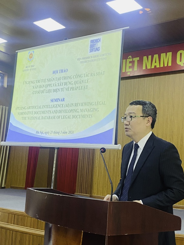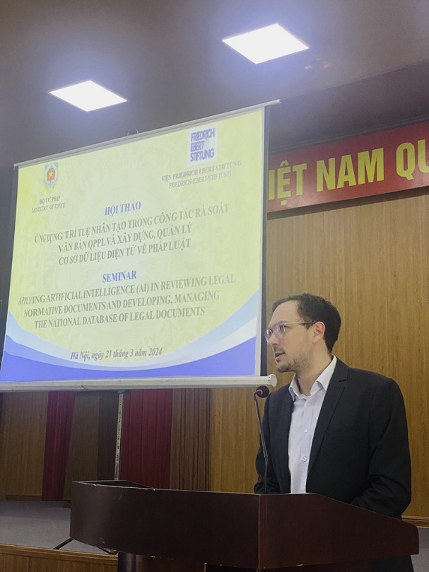 Ngoài ra, Hội thảo cũng được nghe Giáo sư, Tiến sĩ Michael Janensch, Giảng viên Trường Đại học Kinh tế và Kỹ thuật Berlin trình bày nội dung về kinh nghiệm xây dựng, quản lý hệ cơ sở dữ liệu điện tử về pháp luật của Cộng hòa liên bang Đức; Tiến sỹ Đặng Minh Tuấn, Viện trưởng Viện Nghiên cứu ứng dụng công nghệ CMC, đại diện Nhóm Triển khai thử nghiệm Trợ lý ảo rà soát văn bản quy phạm pháp luật trình bày nội dung về ứng dụng trí tuệ nhân tạo trong phần mềm hỗ trợ rà soát văn bản quy phạm luật.