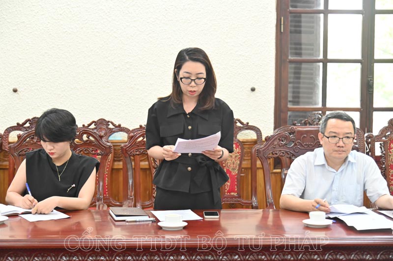 Đồng chí Hoàng Linh Cầm, Phó Chánh Văn phòng phụ trách Cục Kiểm tra văn bản QPPL báo cáo tại cuộc họp.