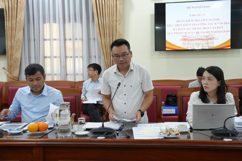 Thay mặt Đoàn kiểm tra liên ngành, đồng chí Nguyễn Duy Thắng, Phó Cục trưởng Cục Kiểm tra văn bản QPPL, Bộ Tư pháp đã thông tin sơ bộ về kết quả kiểm tra theo xác suất các văn bản còn hiệu lực do Bộ Ngoại giao ban hành. Kết quả kiểm tra cho thấy bước đầu một số văn bản còn chưa phù hợp về nội dung, thẩm quyền và hiệu lực; một số văn bản còn sai sót cần rà soát, xử lý theo quy định.