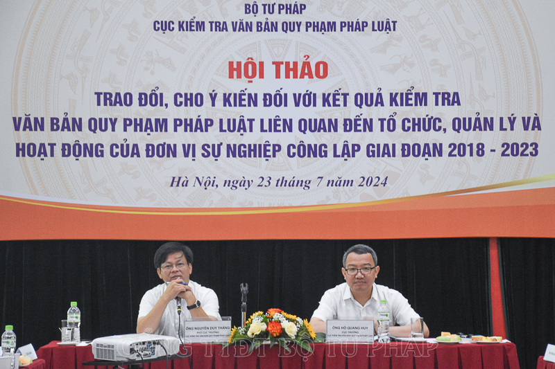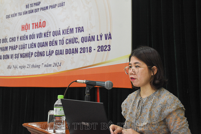 Sau khi nghe đồng chí Trần Thu Giang, Trưởng phòng Kiểm tra khối nội chính, Cục Kiểm tra VBQPPL trình bày khái quát chung về kết quả kiểm tra VBQPPL liên quan đến tổ chức, quản lý và hoạt động của đơn vị sự nghiệp công lập giai đoạn 2018–2023, các đại biểu tham dự Hội thảo đã trao đổi, phân tích, làm rõ một số nội dung về tính pháp lý, thực tiễn xây dựng, ban hành và tổ chức thực hiện các VBQPPL; đề xuất các giải pháp xử lý đối với văn bản có nội dung chưa phù hợp; các kiến nghị hoàn thiện pháp luật trong thời gian tới, đặc biệt các văn bản do cơ quan nhà nước ở Trung ương ban hành.