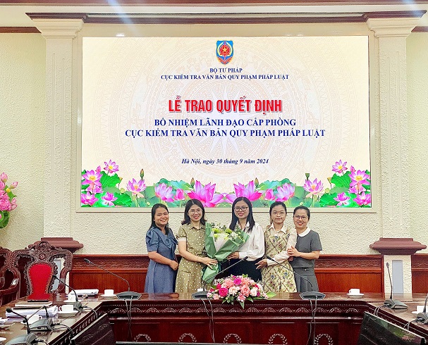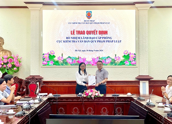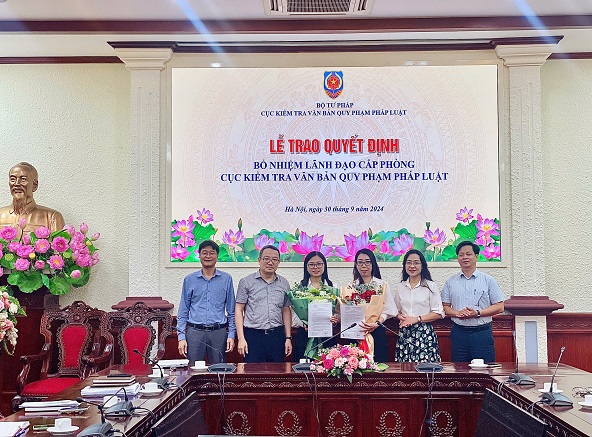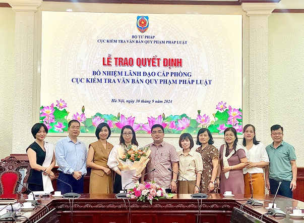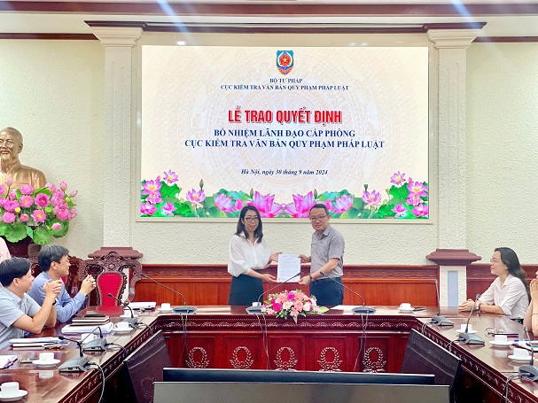 Phát biểu chúc mừng, giao nhiệm vụ cho các đồng chí được bổ nhiệm, đồng chí Hồ Quang Huy - Cục trưởng Cục Kiểm tra văn bản quy phạm pháp luật đã ghi nhận và đánh giá cao sự nỗ lực, đóng góp, gắn bó của hai đồng chí trong công tác của đơn vị và hy vọng, trên cương vị mới, hai đồng chí sẽ tiếp tục phát huy năng lực, sở trường, kinh nghiệm công tác để góp phần vào sự phát triển của cơ quan, đơn vị.
