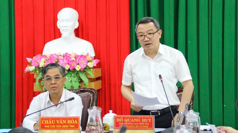 Thay mặt Đoàn kiểm tra, đồng chí Hồ Quang Huy, Cục trưởng Cục Kiểm tra văn bản QPPL cảm ơn sự phối hợp của UBND tỉnh, các sở ngành liên quan, đồng thời đánh giá cao công tác chỉ đạo, điều hành, tạo điều kiện đảm bảo cho công tác kiểm tra, rà soát, hệ thống hóa văn bản QPPL của UBND tỉnh Trà Vinh thời gian qua. Đồng chí Hồ Quang Huy đề nghị UBND tỉnh, Sở Tư pháp và các sở, ngành tiếp tục nâng cao chất lượng, hiệu quả công tác kiểm tra, rà soát, hệ thống hóa văn bản QPPL, đặc biệt quán triệt sâu sắc, toàn diện tư tưởng, chỉ đạo của Đồng chí Tổng Bí thư Tô Lâm và Lãnh đạo Đảng, Nhà nước về đổi mới tư duy trong xây dựng pháp luật; khẩn trương xử lý các vấn đề đã được Đoàn kiểm tra chỉ ra tại một số văn bản; tiếp tục quan tâm, chỉ đạo các sở, ngành thực hiện nghiêm túc, đầy đủ các quy định của Luật Ban hành văn bản QPPL năm 2015 (được sửa đổi, bổ sung năm 2020) và các văn bản hướng dẫn thi hành; thường xuyên tổ chức cập nhật, rà soát, tự kiểm tra văn bản QPPL theo thẩm quyền để nâng cao hơn nữa chất lượng văn bản; chỉ đạo các sở, ngành được giao chủ trì tham mưu, xây dựng văn bản phối hợp chặt chẽ hơn với Sở Tư pháp trong quá trình xây dựng, tiếp thu, giải trình ý kiến thẩm định văn bản của Sở Tư pháp... Đồng chí Cục trưởng cũng đã ghi nhận và giải đáp các kiến nghị, vướng mắc phát sinh trong thực tiễn triển khai nhiệm vụ của địa phương.