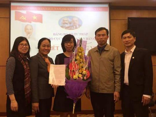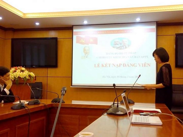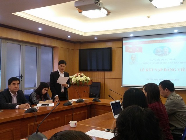 Thay mặt Đảng ủy Bộ Tư pháp, Chi bộ Cục Kiểm tra văn bản, đồng chí Bí thư Chi bộ Đồng Ngọc Ba đã trao Quyết định kết nạp đảng viên cho đồng chí Hoàng Linh Cầm.