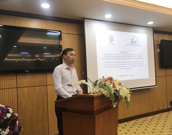 Thực hiện Quyết định số 1270/QĐ-BTP ngày 06/6/2019 của Bộ trưởng Bộ Tư pháp phê duyệt kế hoạch hoạt động năm 2019 của Dự án hài hòa hóa pháp luật hiện hành và thống nhất áp dụng pháp luật hướng tới năm 2020 (Dự án Jica), ngày 23/9/2020, Cục Kiểm tra văn bản quy phạm pháp luật đã tổ chức thành công Hội thảo khảo sát lấy ý kiến về kết quả rà soát, nắm bắt, tiếp nhận các thông tin phản ánh về nhóm văn bản mâu thuẫn,chồng chéo, bất cập, kìm hãm sự phát triển tại Hà Nội. Đ/c Đồng Ngọc Ba – Cục trưởng Cục Kiểm tra văn bản QPPL – chủ trì hội thảo cùng các đại biểu là đại diện Vụ pháp chế các Bộ, ngành; đại diện các Sở Tư pháp, Sở Tài nguyên và Môi trường, Sở Tài chính, Sở Nội vụ, Sở Xây dựng của một số địa phương phía Bắc. Về phía Dự án Jica có sự tham gia của ông Yokomaku Kosuke - Cố vấn trưởng Dự án Jica tại Việt Nam.